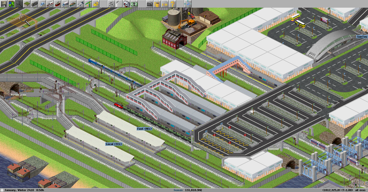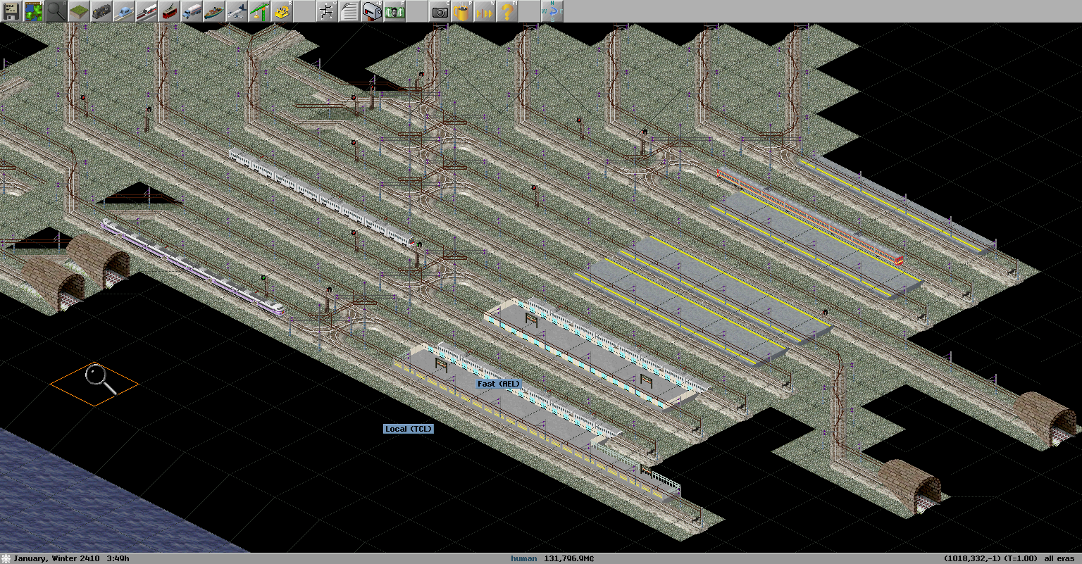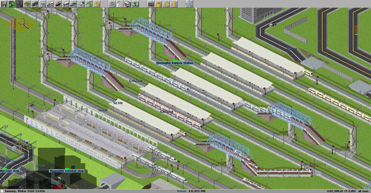 首先,我們來看看邊境的車站"山頭",此處路線連接了我方和對方的領土,主要由巴士和鐵路連接。從圖中可見我方使用的地鐵列車,和對方使用的九鐵列車,貨運列車也會通過這個關口。地底就是另一個世界,複雜的路軌配置,供安年與舊區連接的城鐵列車營運,以及舊區本身的地下鐵路,分擔地面地鐵的客流量。