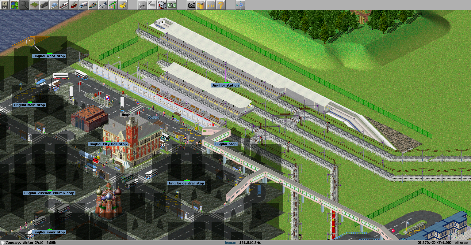 "靜海"是本地圖最西面的車站,連絡高鐵、跨城鐵路、地鐵和超級高鐵。由於位於偏遠地區,車站的規模有限,月台的數量只是幾個,但就成為多條路線的終點站。