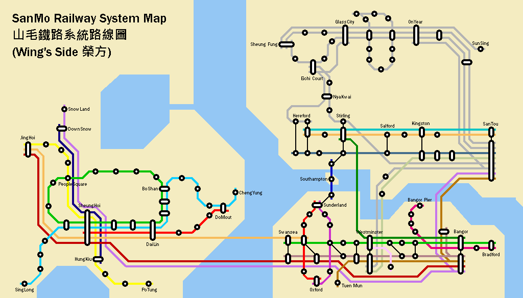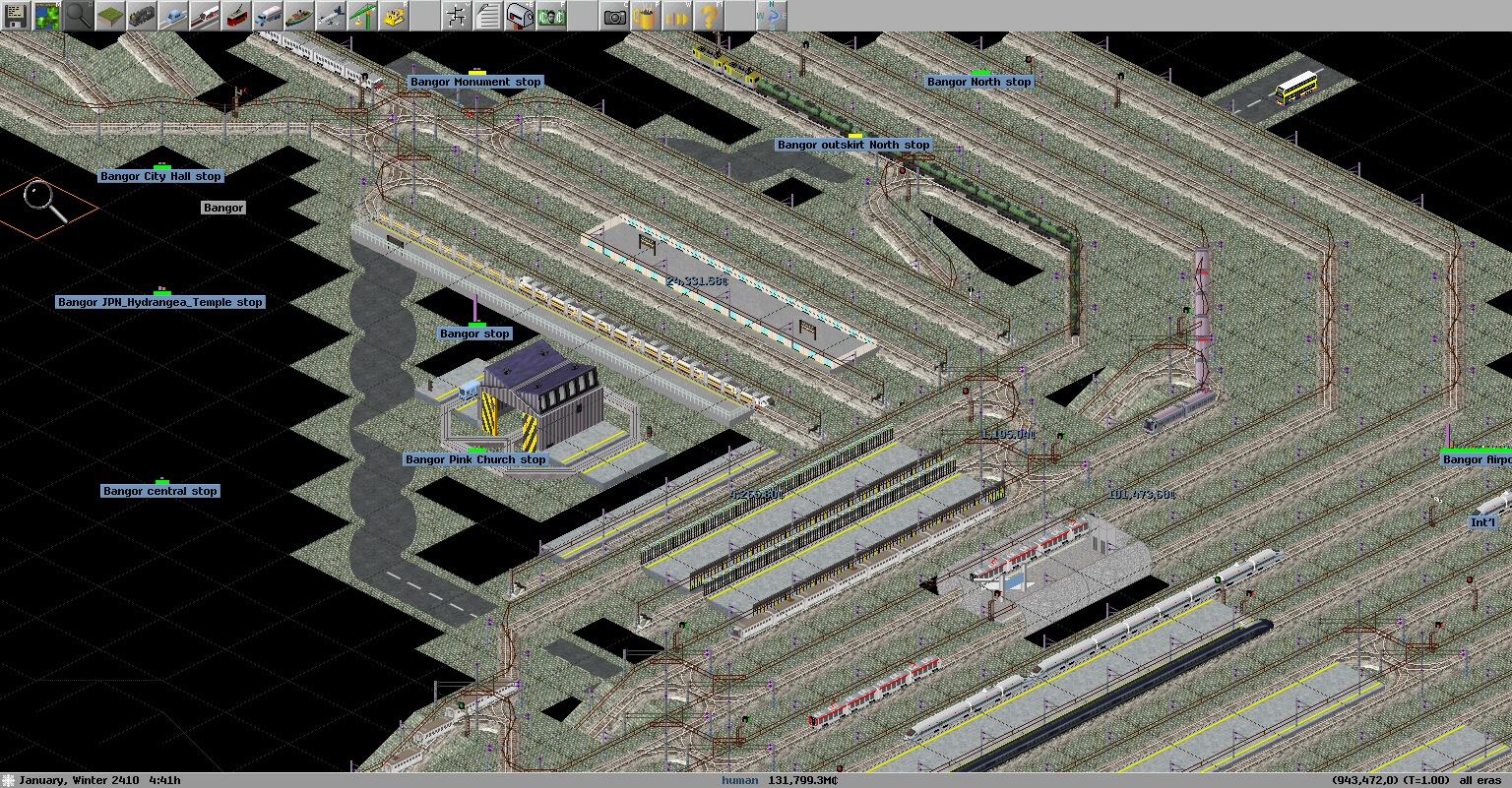 我方最大市區"Bangor"的Bangor機場是全地圖最大型的鐵路車站,從輕軌到地鐵以至城鐵和高鐵,再有超級高鐵,佔用地底極大量空間,差不多是地面上機場面積的兩倍。城鐵第三期和地鐵車站是最早落成的,其後過海高鐵通車,新增了直通月台和終點站月台,隨著地下鐵路的需求,西面部份又建設了多個月台,並提供較長的站台予跨城鐵路使用。